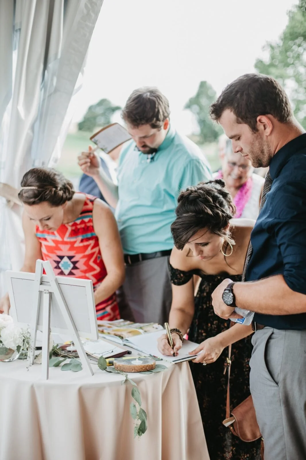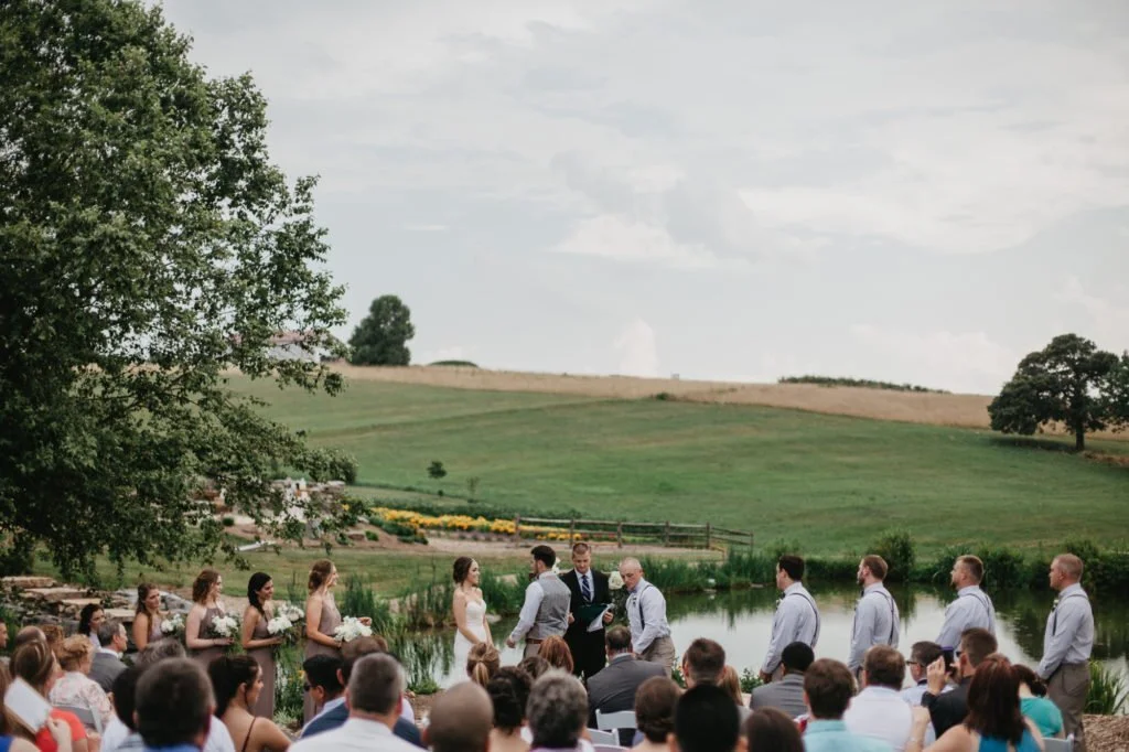 "I felt an indescribable calmness when I woke up and it followed me throughout my wedding day. God sent a perfect cover of clouds to shade us from the record heat just in time for the ceremony and even sprinkled a few rain drops for good luck. I thought I would be stressed, nervous and self-conscious being the center of attention all day but I only felt happiness and peace."Jess shared these words the day after her and Steve's wedding. Their joy and peacefulness were so clear and I loved seeing the two of them smiling happily at one another throughout the day! They also did an amazing job surviving the heat wave and still looking adorable. The Fredrick-area Maryland venue Glen Ellen Farm was an incredible backdrop to their sweet green and white florals, gold and green details, and flowing, dusty purple bridesmaids dresses...as well as dozens of huge smiles, tears of happiness, and hugs! On top of all of this loveliness, I have known Jess since she was one of the "big kids" of our family friend group. She's as sweet today as she was then! And Steve is such an amazing match for her. They are so wonderful together. Enjoy the photo story of their rustic, sunny, blue-skied farm wedding!